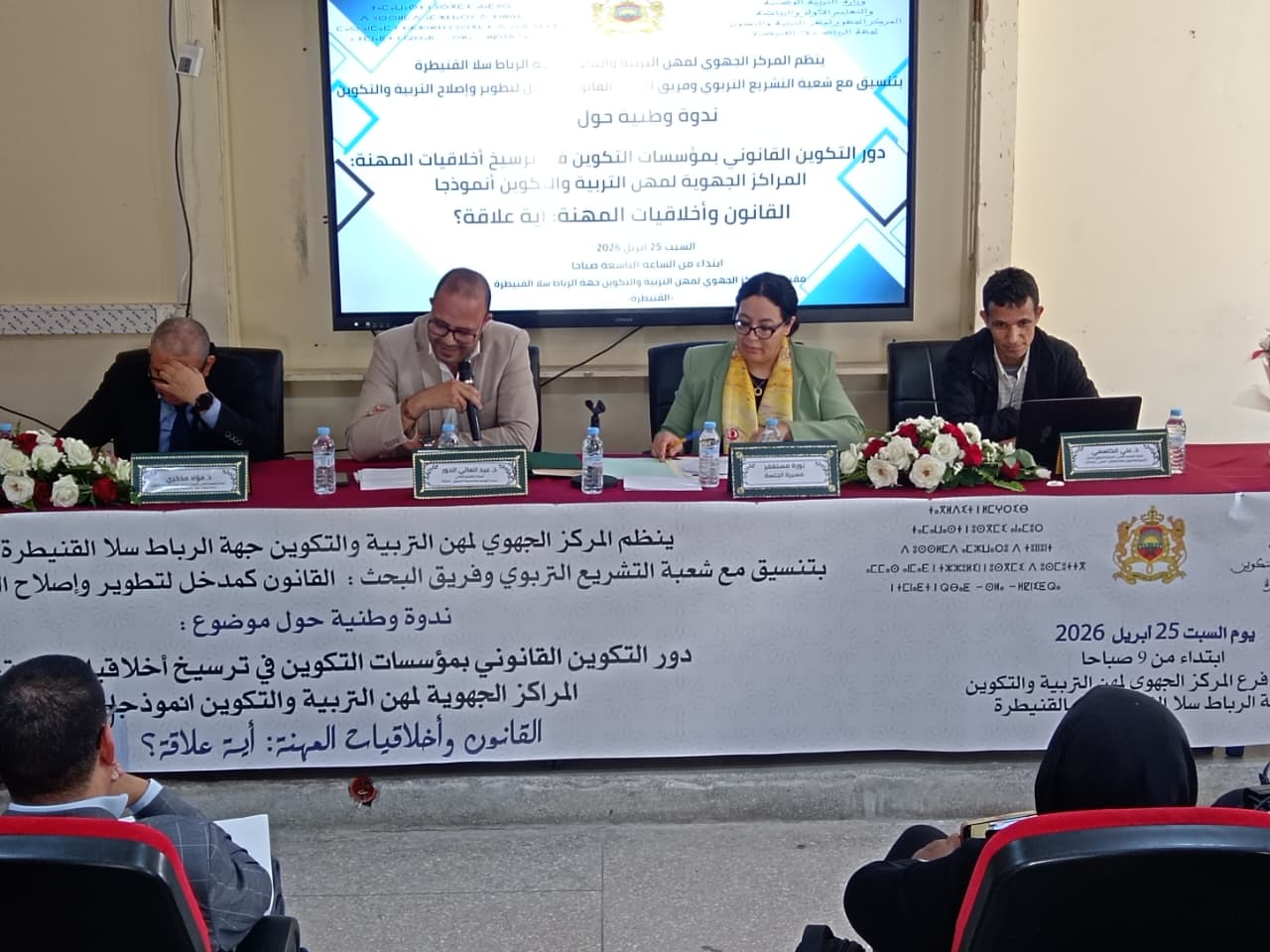 نظم المركز الجهوي لمهن التربية والتكوين لجهة الرباط سلا القنيطرة، بشراكة مع شعبة التشريع التربوي وفريق البحث ” القانون كمدخل لتطوير وإصلاح التربية والتكوين “، ندوة وطنية علمية حول موضوع: “دور التكوين القانوني بمؤسسات التكوين في ترسيخ أخلاقيات المهنة”، وذلك يوم السبت 25 أبريل 2026 بمقر فرع القنيطرة. وقد شكل هذا الموعد العلمي فضاءً للحوار الرصين وتبادل الرؤى بين نخبة من الأكاديميين والخبراء والفاعلين التربويين، في محاولة لتجسير الهوة القائمة بين النصوص القانونية المجردة ومتطلبات الممارسة المهنية القائمة على القيم.